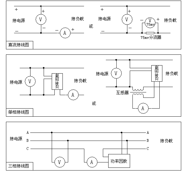 當(dāng)采集“三相”電參數(shù)時,電壓傳感器輸入端連接至Uab;電流傳感器輸入端連接至Ic;功率因數(shù)傳感器輸入端連接至Uab、Ic??刹捎没ジ衅鲾U(kuò)大電流量程,互感器的連接方法同單相接線圖的互感器部分。
